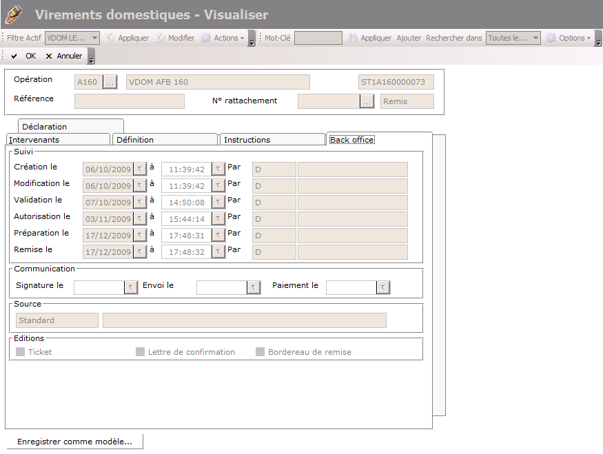 For each action on a transfer, the date, time and user are displayed and cannot be modified.