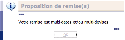 - If the transfers do not have the same format or if they are associated with different constitution rules, the Remittance Proposals dialog box appears to warn you, stating that they cannot be part of the same remittance. Click OK.