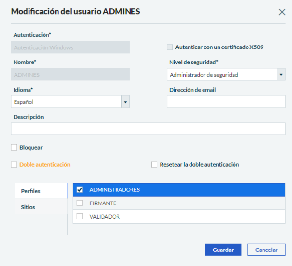 - Si se desea aplicar una gestión de derechos de acceso a las aplicaciones en la que cualquier operación que realice un administrador de seguridad tenga que validarla un segundo administrador de seguridad, hay que seleccionar [Los derechos de acceso los concede un administrador de seguridad de nivel 1 y los valida un administrador de seguridad de nivel 2].