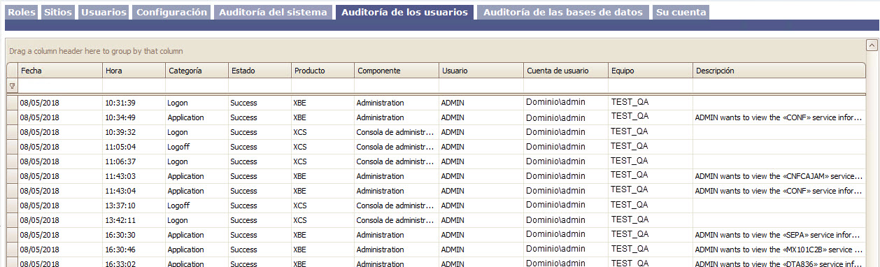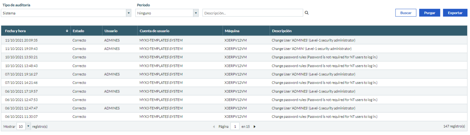 En la tabla Auditoría del sistema, se describen todas las acciones ejecutadas en un instante T por cada usuario.