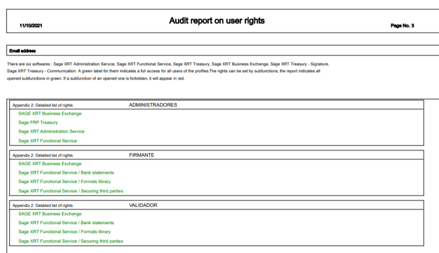 La consola de administración Sage XRT Common Services permite editar un informe en el que se detallan las funcionalidades autorizadas o no autorizadas para cada perfil, en cada una de las aplicaciones de la plataforma.