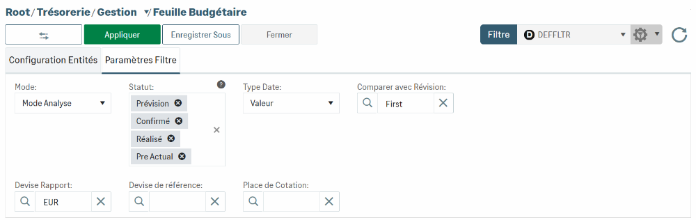Dans l'onglet Paramètres Filtre, le menu déroulant Mode détermine le mode d'affichage du budget.