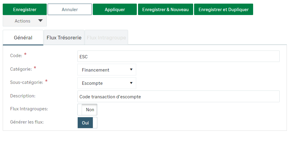 Dans le formulaire de création, sélectionnez Financement comme Catégorie et Escompte comme Sous-catégorie et complétez le reste de l'onglet Général.