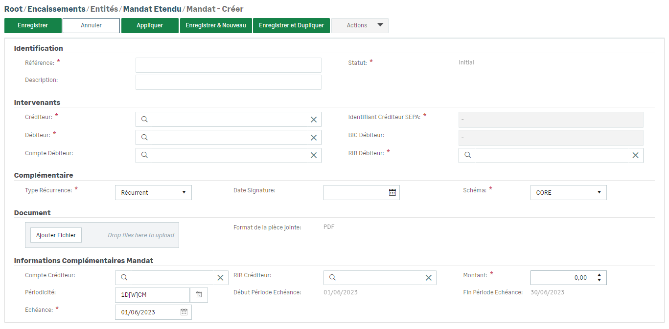 La notion de mandat étendu, exclusivité de la plate-forme Sage XRT Solution, vous permet de saisir plus facilement le mandat et les prélèvements qui en dépendent dans un seul formulaire.