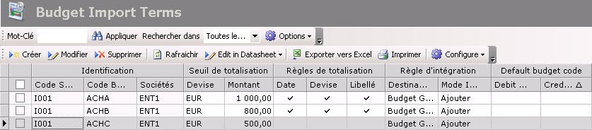 Le tableau affiche également les modalités d'importation spécifiées : le code de la nature budgétaire, le code de l'entité, le montant et la devise du seuil de totalisation, ainsi que la date, la devise et le libellé de la règle de totalisation.