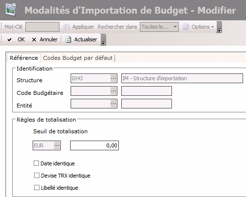 La configuration des modalités d'importation de transactions consiste à spécifier le seuil de totalisation des montants, c'est-à-dire la limite à partir de laquelle les transactions ayant la même nature budgétaire, la même date et la même devise sont importées individuellement et non fusionnées dans une transaction globale.