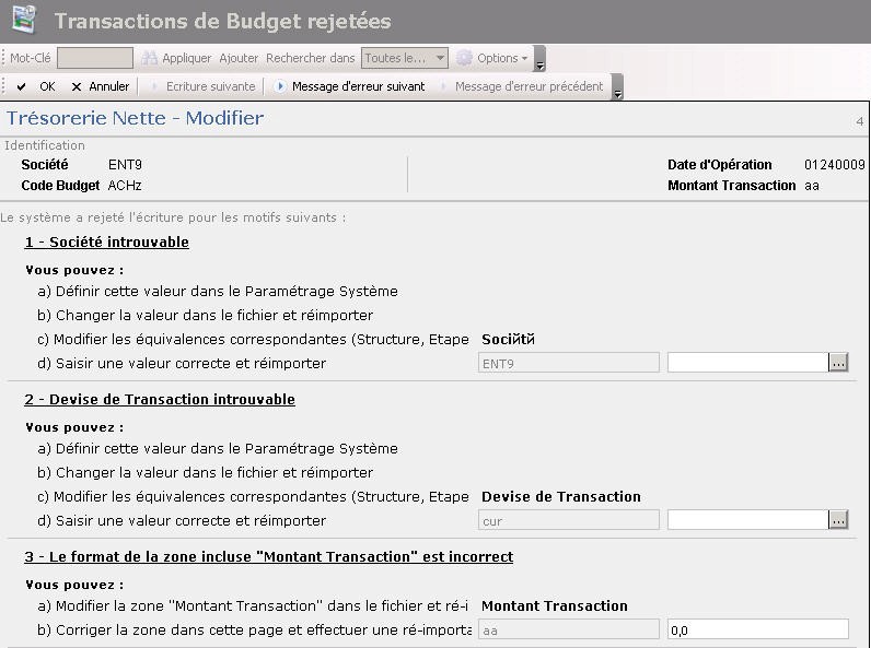 Les transactions dites rejetées ne sont pas intégrées dans le budget. Elles sont enregistrées dans un historique avec des motifs de rejet spécifiant les informations absentes ou incohérentes avec le référentiel de données de Sage XRT Treasury.