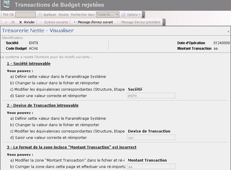 - S'il existe d'autres messages d'erreur non affichés dans la page en cours pour la transaction sélectionnée, utilisez les boutons Message d'erreur précédent et Message d'erreur suivant pour naviguer entre les pages détaillant les messages d'erreur.