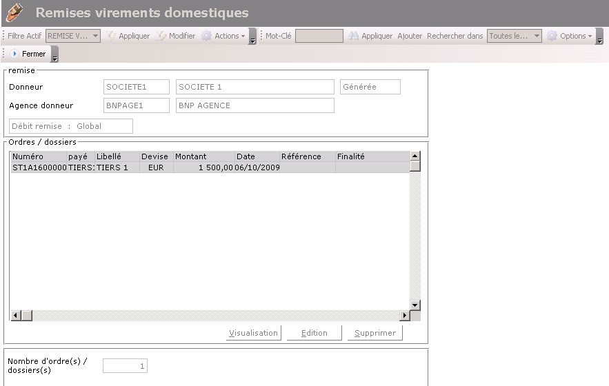 | Remise constituée (préparation des virements) | Générer la remise Enlever des ordres Supprimer la remise |